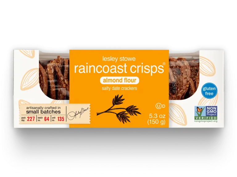 Almond Flour Salty Date Raincoast Crisps by Lesley Stowe Fine Foods $7.10 Gluten free and flavor full crisps from a female owned company that pair well with cabernet sauvignon, chianti, ale, or a dry Riesling. Serve with applewood smoked cheddar, Colby, Havarti, prosciutto, and soft spreads. They maintain their crispness, so food will not fall on your lap.
