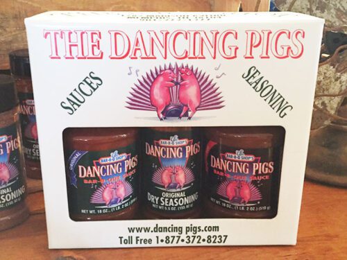 The Dancing Pigs Gift Box from The Bar-B-Q Shop $71.99 The BBQ gift box includes an 18 oz. bottle of Original Dancing Pigs Bar-B-Que Sauce, an 18 oz. bottle of Hot Dancing Pigs Bar-B-Que Sauce, and one 5.0 oz. jar of Dancing Pigs Dry Seasoning. The gift box is sold at The Bar-B-Q Shop, which is a Black family-owned award-winning business and Memphis, TN destination. These BBQ essentials elevate your BBQ flavor and make your meat , fish, or chicken something to savor. The box is a welcomed gift for any grill cook. www.thebar-b-qshop.com