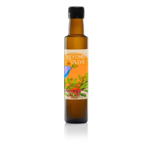 Beyond The Olive Joly Jalapeno Co-Pressed Olive Oil $34 for 375ml Joly Jalapeno Co-Pressed Olive Oil is a beautiful blend of fresh jalapenos and premium olive oil that creates a spicy combo that kicks up your culinary endeavors. Add the spicy California olive oil to grilled chicken or meats, pizza dough before baking, or your favorite caliente sauces and grilled vegetables. www.beyondtheolive.com